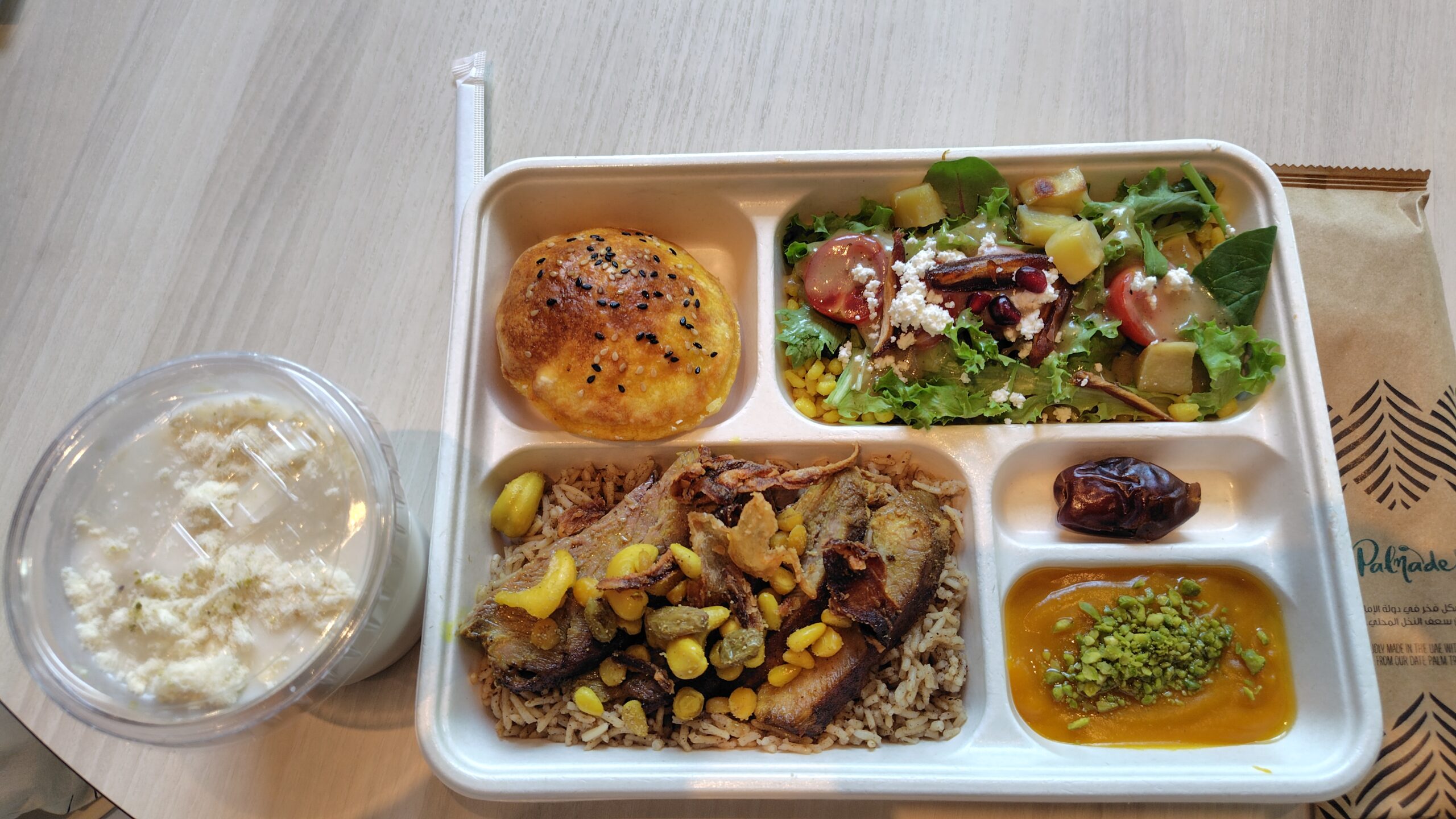 2025.8.16 「アラブ首長国連邦パビリオン レストラン」 14:20頃で35分くらいの待ち ラム・ウージ、ハリースサラダとアシーダ ラフシュ…