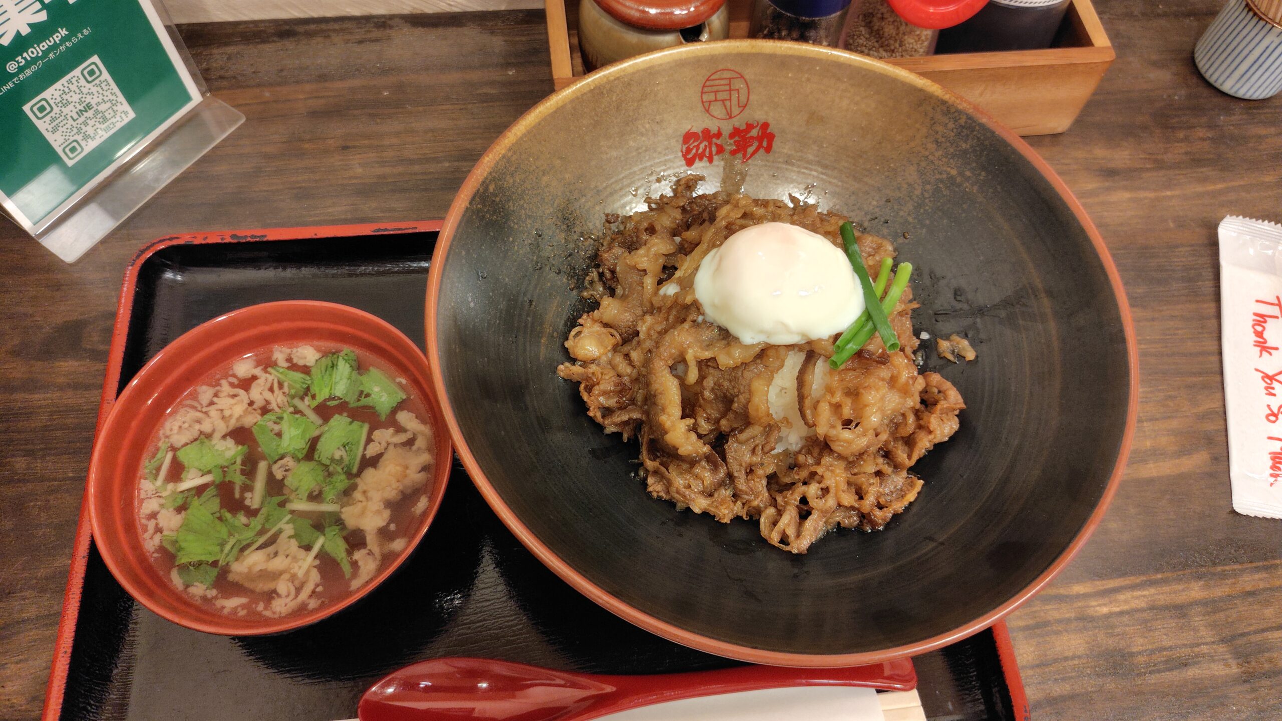 2025.8.21 「和牛丼 弥勒」和牛丼の卵付き・牛すじスープセット 神戸元町駅より三宮方面に行ったところにある「和牛丼 弥勒」でランチ。13時過ぎの到着で店内…